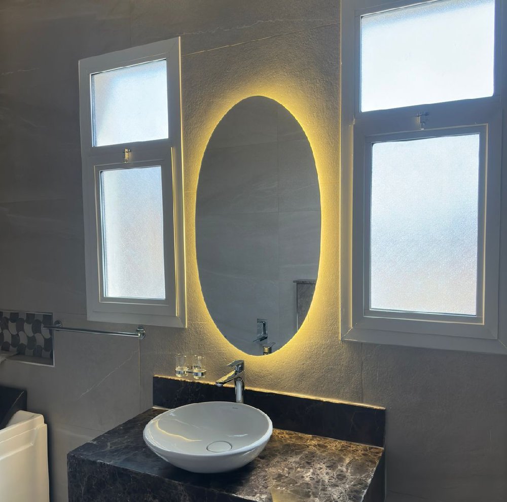 A bathroom needs proper lighting to be functional, and effective lighting. a backlit mirror usually works with LED Mirror lights sitting behind the mirror, outlining its perimeter giving off a sublet but sufficient light with a relaxing glow. very modern mirror.